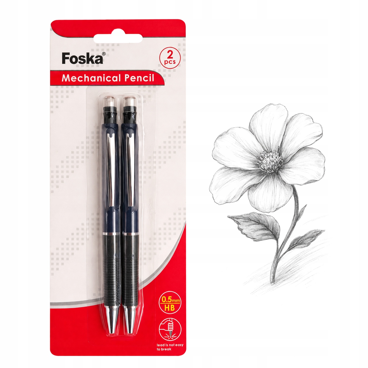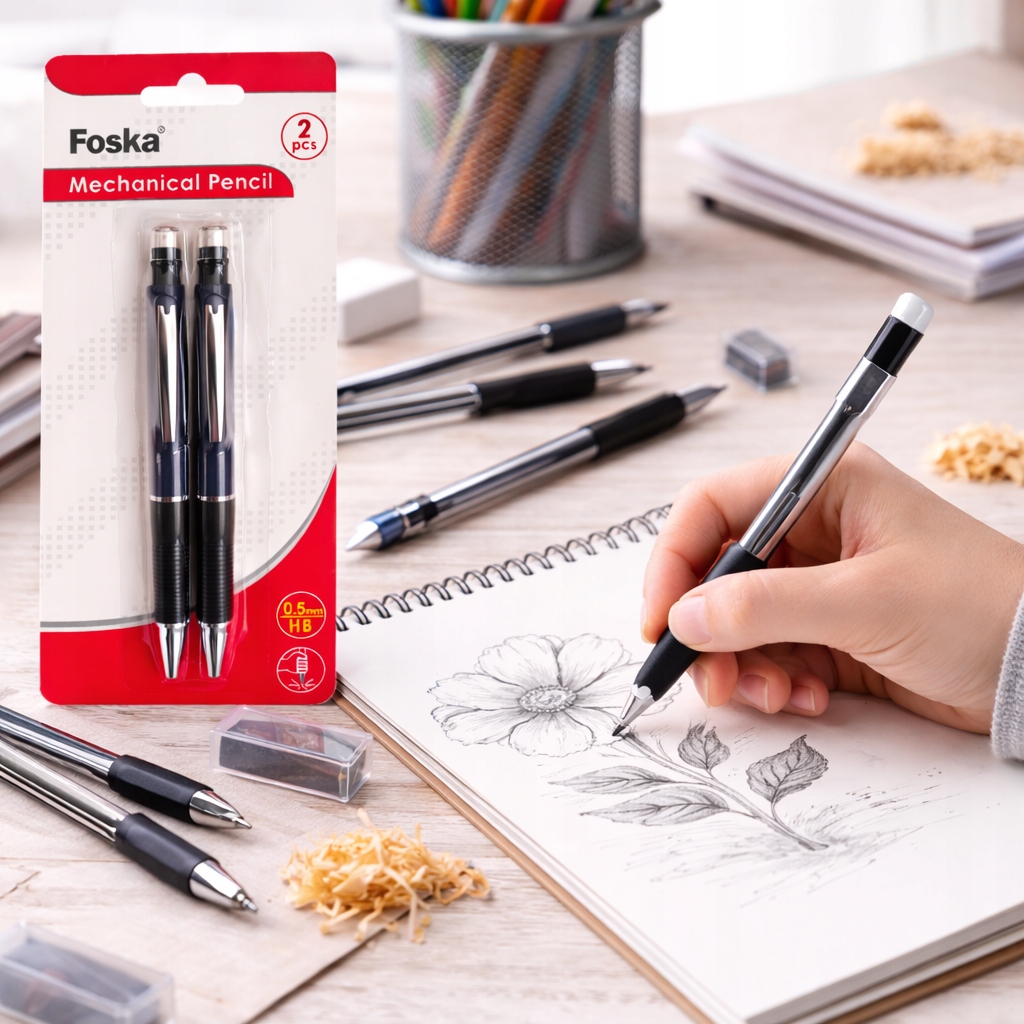 Praktyczny i wygodny w użytkowaniu zestaw dwóch ołówków mechanicznych, idealnych do szkoły, biura oraz codziennego użytku. Dzięki cienkiemu grafitowi 0,5 mm zapewniają precyzyjne pisanie oraz rysowanie, a wbudowana gumka pozwala na szybkie i wygodne poprawki.