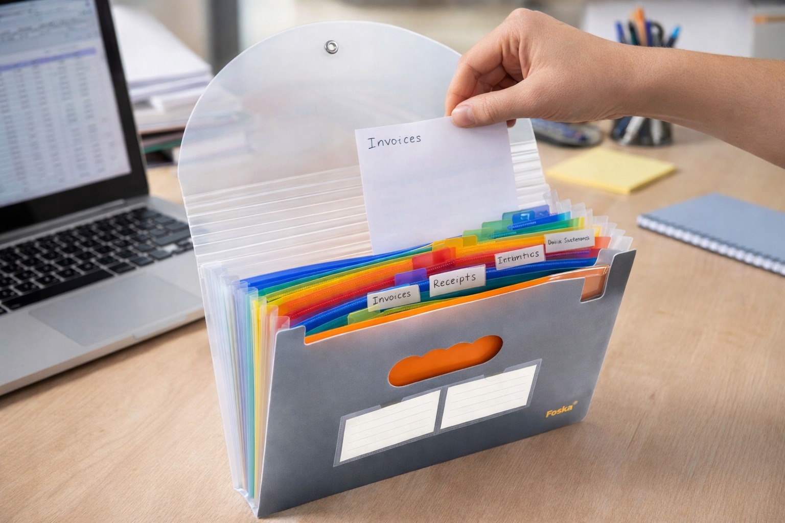 Teczka wyposażona jest w wsuwane znaczniki przy każdej przegródce, dzięki którym możesz podpisać i opisać zawartość – np. faktury, umowy, szkoła, projekty itp. To jeszcze bardziej ułatwia utrzymanie porządku i szybkie odnajdywanie dokumentów.